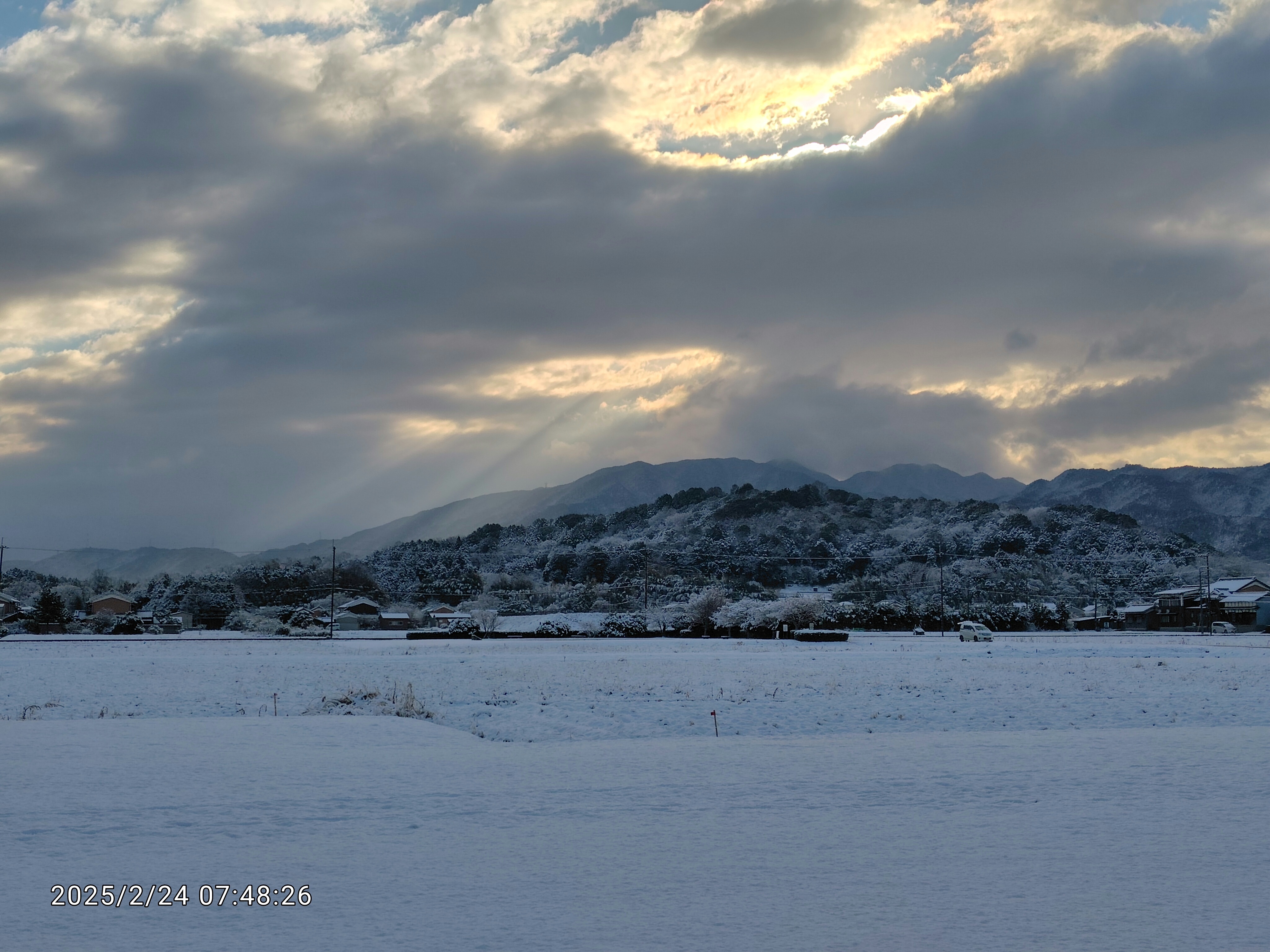 雲の隙間から差し込む光(天の光)が、天孫降臨を思わせる。